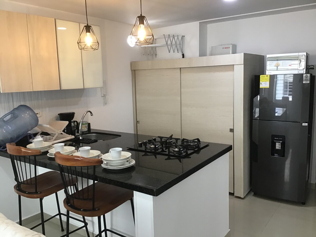 Bine ați venit în apartamentul nostru confortabil din San Gil! Situat în inima Sangil Plaza Mall, apartamentul nostru oferă confort și comoditate la câțiva pași de ușa ta. Spațiul nostru are două camere: una cu un pat dublu pentru odihna ta totală și o cameră auxiliară cu două paturi de o persoană pentru însoțitori sau membri ai familiei. De asemenea, în living vei găsi o canapea extensibilă confortabilă pentru oaspeți suplimentari. WI-FI de mare viteză pentru a vă menține conectat.