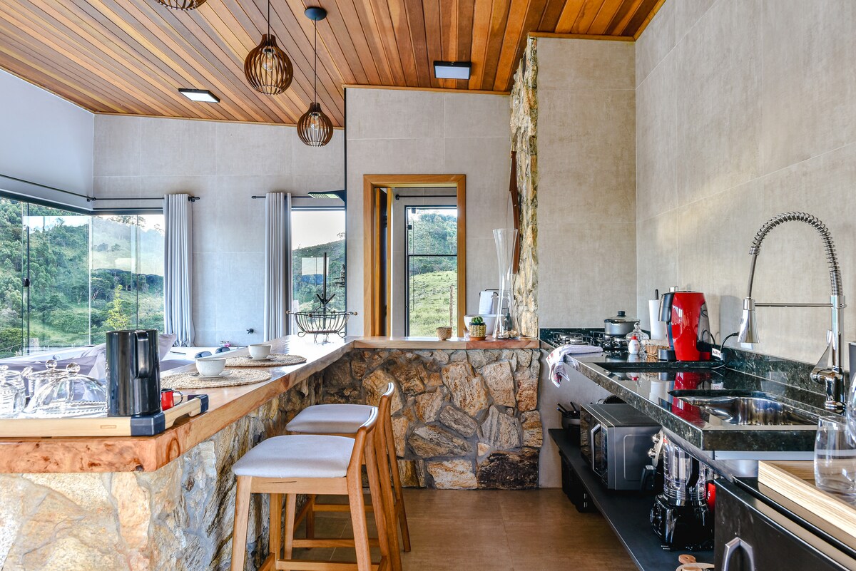 Ce-ar fi să vezi peisajul transformându-se peste ore? Stele, lună, zori... O experiență de imersiune în natură, cu confort și intimitate. Cadă de înmuiere pentru două persoane, încălzire cu gaz și toate cele cu o priveliște luxuriantă! Tariful tău zilnic include deja micul dejun. Încălzire cu gaz, pat fierbinte, loc pentru foc. Caipira Bucătărie cu minibar și răcitor, aragaz cu lemne, cuptor cu microunde. Baie privată. Avem serviciu parțial de restaurant pentru cină