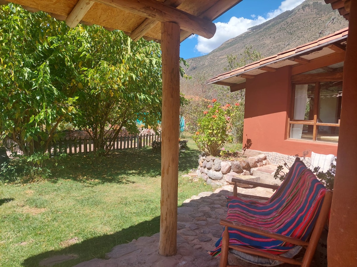 Relaxează-te și bucură-te de energia revigorantă a Văii Sacre. Folosește propria grădină privată sau caută pârâul, plimbarea cu orhidee, groapa de foc și zona piscinei. Cabana confortabilă cu 3 paturi poate fi închiriată cu propriul apartament suplimentar cu intrare separată sau cu un studio mai complet / independent (listat separat) pentru 2 persoane, ambele amplasate pe terenul frumoasei noastre case andine. Link-ul studioului este : airbnb.com/roomsэ11144