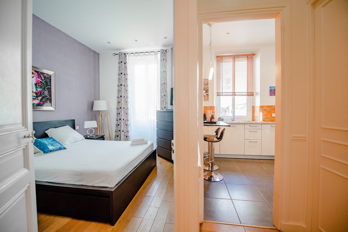 Apartament de lux cu 2 dormitoare, living, internet rapid prin fibră optică, Netflix etc. Situat perfect pe o stradă cu sens unic, cu trafic calm, fără mirosuri neplăcute de restaurant sau baruri pe stradă, fără scări în spirală! Frumoasă fațadă franceză din exterior, frumoasă, proaspăt renovată în stil francez.