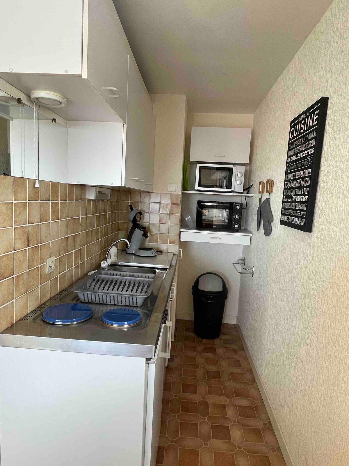 Sunset Beach: priveliști excepționale. Studio spațios de 28 m2 pe malul mării în stațiunea de familie St. Cécile Renovat în 2022. Convertibil cu o bază de pat reală, pat dublu în dormitor. Duș frumos, chicinetă utilată, Dolce Gusto, filtru de cafea, mașină de spălat vase, frigider cu congelator, plită cu inducție, cuptor cu microunde, prăjitor de pâine, fierbător electric, TV, difuzor Bluetooth, internet, Wi-Fi cu fibră optică, prize USB.