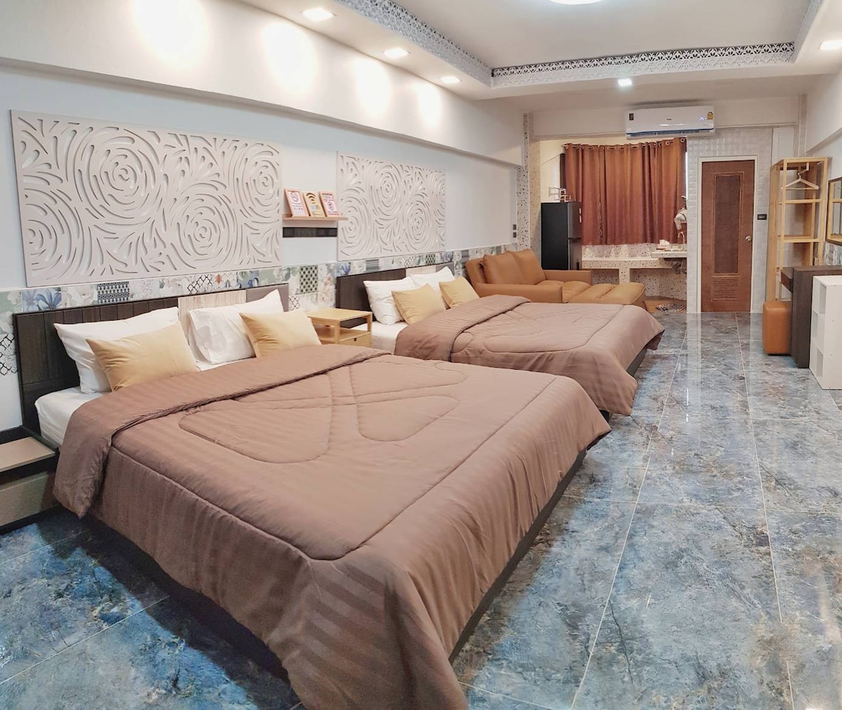 💁🏻‍♀️CHECK-IN TÂRZIU ESTE BINEVENIT👌🏻 Cameră recent renovată în apartament local din piața Pratunam. •Se poate merge pe jos până la TOFU,Platinum, decembrie, CTW(Gentle Women, Pop Mart), Big C, Siam Paragon. •Aici îți vei petrece viața la fel ca localnicii, apartamentul este o clădire veche de pe piața en-gros, dar sigură și confortabilă. 🛏️Relaxează-te în vacanță cu 2 paturi matrimoniale și o canapea extensibilă. 🧺Ușor de reîmprospătat toate hainele cu o mașină de spălat și un spațiu uscat la balcon. Sunt puse la dispoziție 🧴prosoape și articole de toaletă.