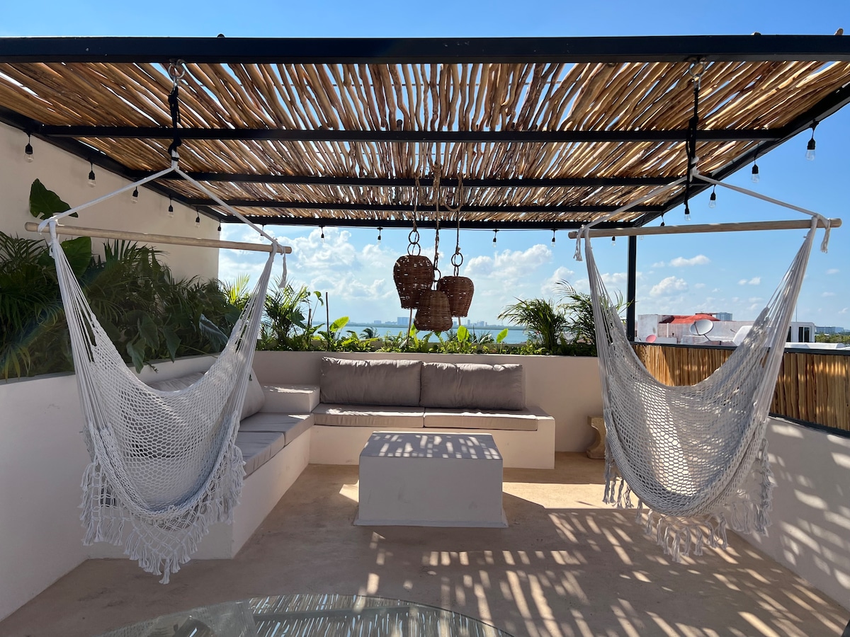 Suntem situați vizavi de Playa Tortugas, în inima zonei hoteliere, cu un acoperiș privat care se deschide direct pe puntea piscinei infinit. Bucură-te de priveliști de neegalat la 360º asupra oceanului turcoaz și a lagunei masive din Cancun. Apartamentul nostru de lux este ideal pentru două persoane, dar poate găzdui până la 3 adulți și oferă multe conforturi. Ia un feribot până la Isla Mujeres sau bucură-te de plaja de peste drum. Linie de autobuz în față, centru de petreceri la 5 minute de mers cu mașina. Magazin de proximitate și farmacie în incintă.