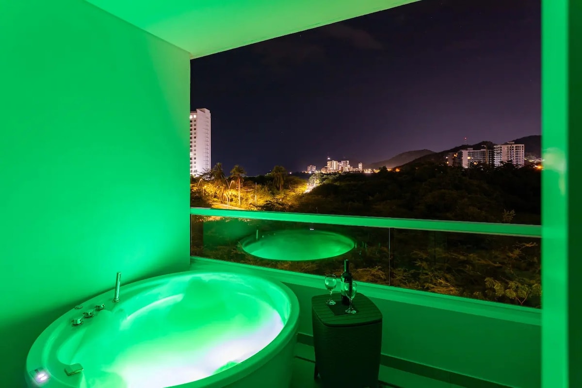 🧚Apartament confortabil cu pat matrimonial, baie, bucătărie utilată, jacuzzi privat și balcon cu living. Include curățenie zilnică în stil hotelier. Situat în hotelul Porto Horizonte, în Bello Horizonte, cel mai bun sector turistic din Santa Marta. La doar 2 minute de mers pe jos de plajă🏝️. Fără taxe suplimentare sau cătușe, toate incluse. Garantăm cele mai bune tarife și servicii care îți vor depăși așteptările ⭐️⭐️⭐️⭐️⭐️
