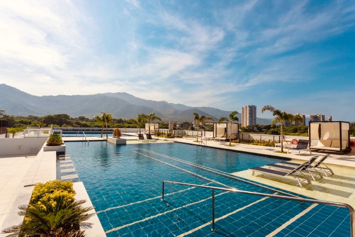 Apartament spectaculos de 100 m2, la doar 5 minute de mers pe jos de una dintre cele mai bune plaje din Santa Marta. Bucură-te de 3 piscine, 4 jacuzzi, saună și vedere la rezervația Irotama. 2 balcoane pentru a privi cele mai frumoase apusuri de soare. La câțiva pași de mall-ul Zazué cu supermarket, restaurante, bancomate și cafenele. Bucătărie complet utilată. Relaxează-te într-un loc confortabil, sigur și plin de detalii pentru odihna ta.