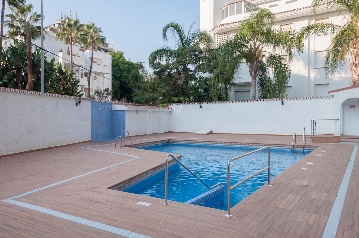 „ACASĂ” DEPARTE DE CASĂ Cum ar trebui să se simtă locuința: un apartament nou-nouț, complet renovat, cu toate dotările necesare. La 4 minute de mers pe jos de plajă și la 10 minute de mers pe jos de gară (Montemar Alto). Apartament situat la etajul 2, cu lift orientat spre grădina interioară și piscină și împrejurimi liniștite. Bucătărie nouă complet utilată, 1 terasă, unități AC în toate camerele și o baie nouă de designer, WiFi GRATUIT și TV 4K cu SmartTv