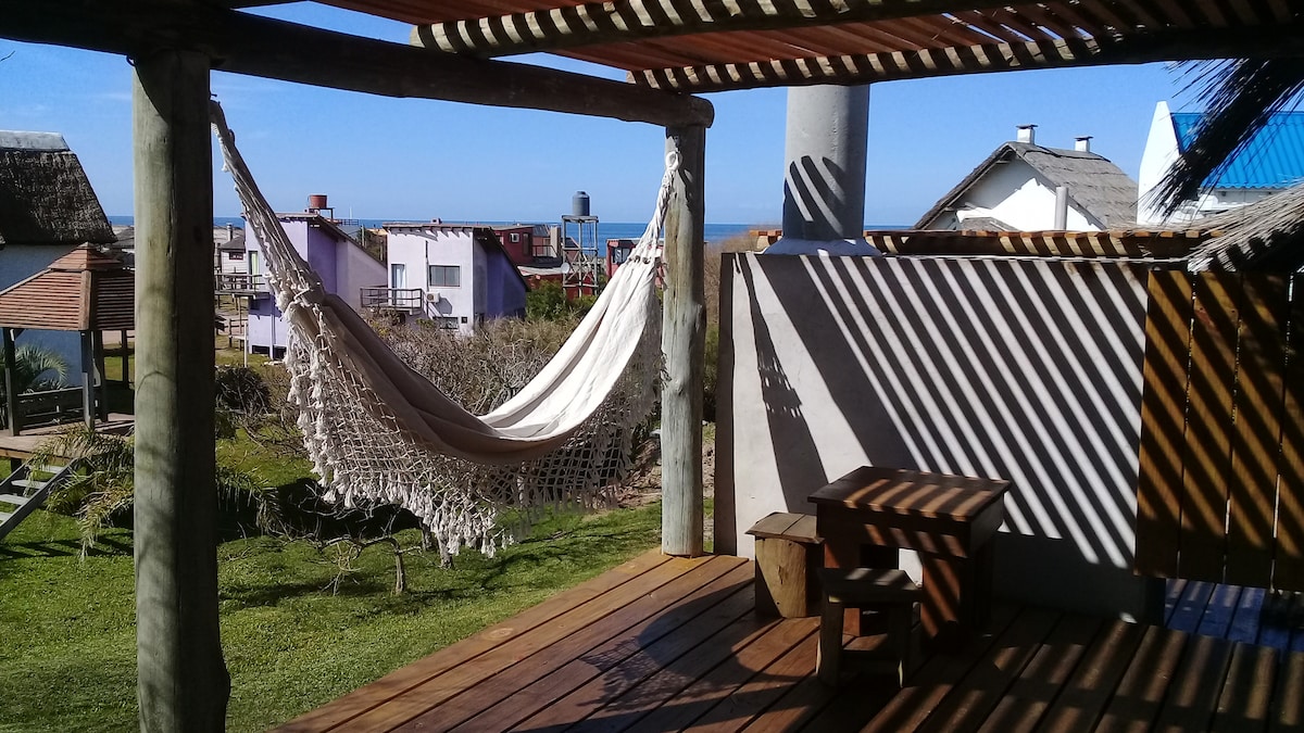 Esta cabaña se encuentra en un punto privilegiado del pueblo. A dos cuadras del centro y sobre un costado del casco histórico, promueven con su arquitectura, la esencia del lugar. Levantadas sobre palafito y construidas íntegramente en madera y paja estas casas tienen una vista inigualable al mar. Por dentro cuentan con todo lo necesario para disfrutar Punta del Diablo.