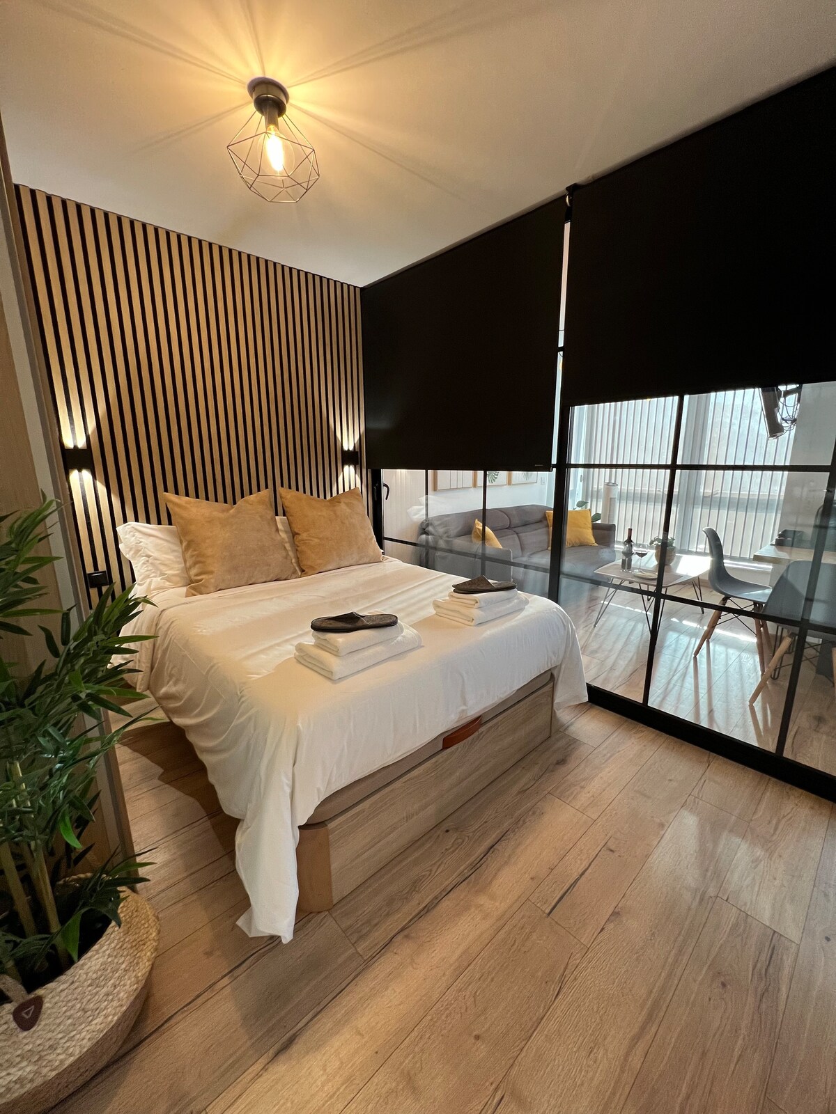 O experiență de lux în acest apartament central și luminos, echipat ca apartament de hotel. Clădire istorică. Dormitorul, prezidat de un pat matrimonial confortabil, Smart TV, balcon și o baie completă. Livingul are o bucătărie americană cochetă, o sală de mese, un Smart TV de format mare, o masă de lucru confortabilă lângă fereastră și o canapea extensibilă. Două ferestre de trei metri înălțime, cu balcoane cu vedere la „Puerta del Sol de Vigo”. Aproape de port - Islands-Cis