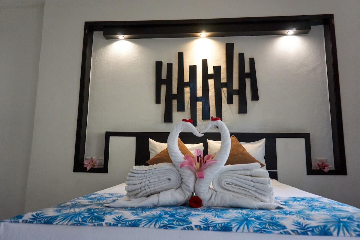 Retragere la nivel superior la 6 străzi de Malecón. Relaxează-te într-un pat matrimonial, transmite în flux cu fibră rapidă de 50/50 Mbps și bucură-te de baia privată. Scafandrii primesc coșuri de gunoi; lucrătorii de la distanță primesc un bar de cowork umbrit. Mergi pe jos până la cafenele, tacos și feribot în câteva minute. Aer condiționat, check-in independent cu încuietoare inteligentă și parcare privată: 1 spațiu pentru mașină (primul venit), 4 golfuri pentru scutere și 5 suporturi pentru biciclete. Închirieri de scutere la proprietate. Rezervă excursii de snorkeling, scufundări sau tururi Jeep cu noi.