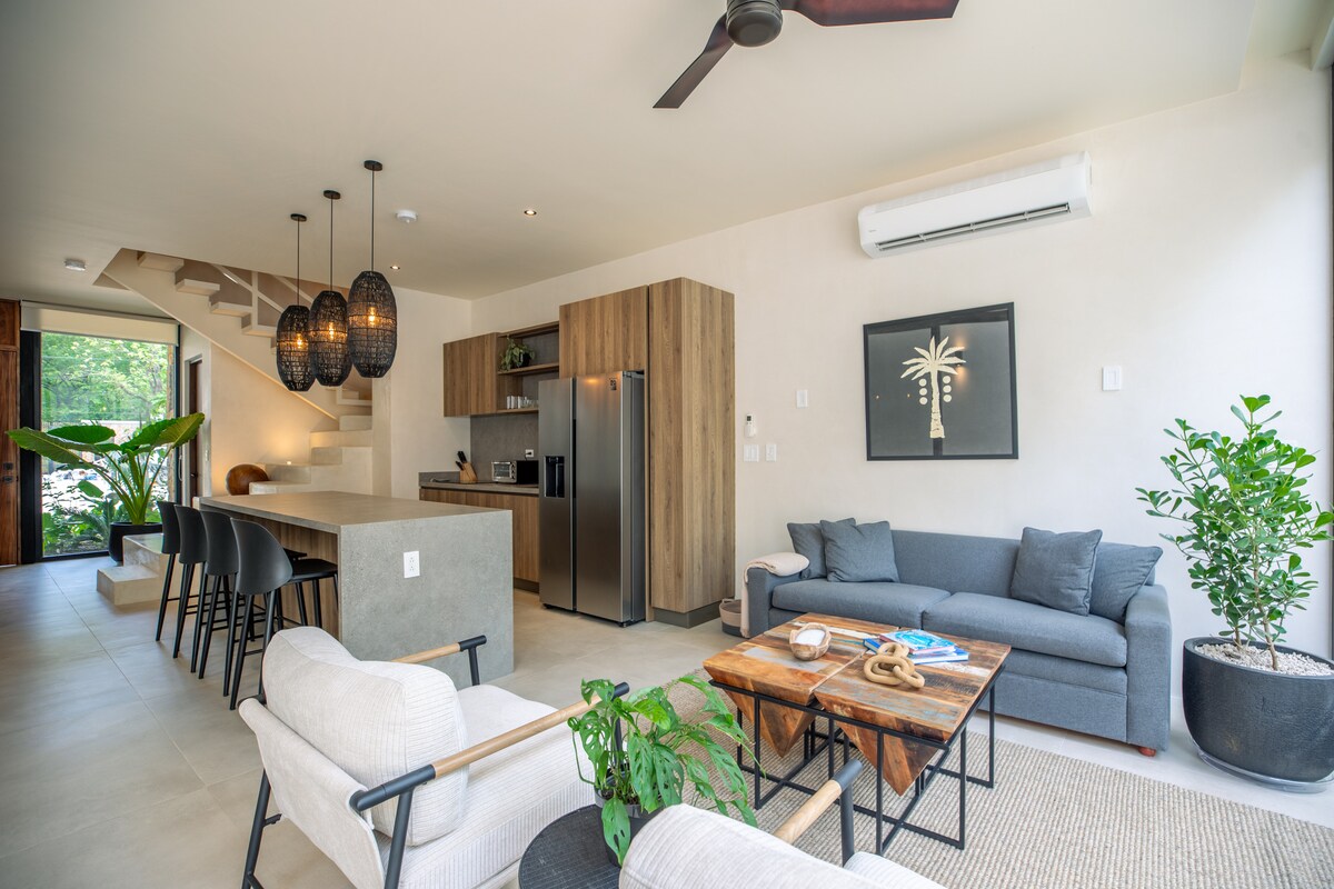 Sanctuarul tău de pe plajă te așteaptă în acest studio elegant/1BA cu fler marocan modern. Situat ideal în apropiere de plajă, magazine și restaurante. Cocoțat la etajul al treilea printre vârfurile luxuriante ale copacilor, oferă intimitate, priveliști uluitoare și vizite ocazionale de la maimuțe urlătoare. Bucură-te de o bucătărie completă și de o verandă privată ecranată, cu o cadă de baie, perfectă pentru cupluri, prieteni sau nomazi digitali.