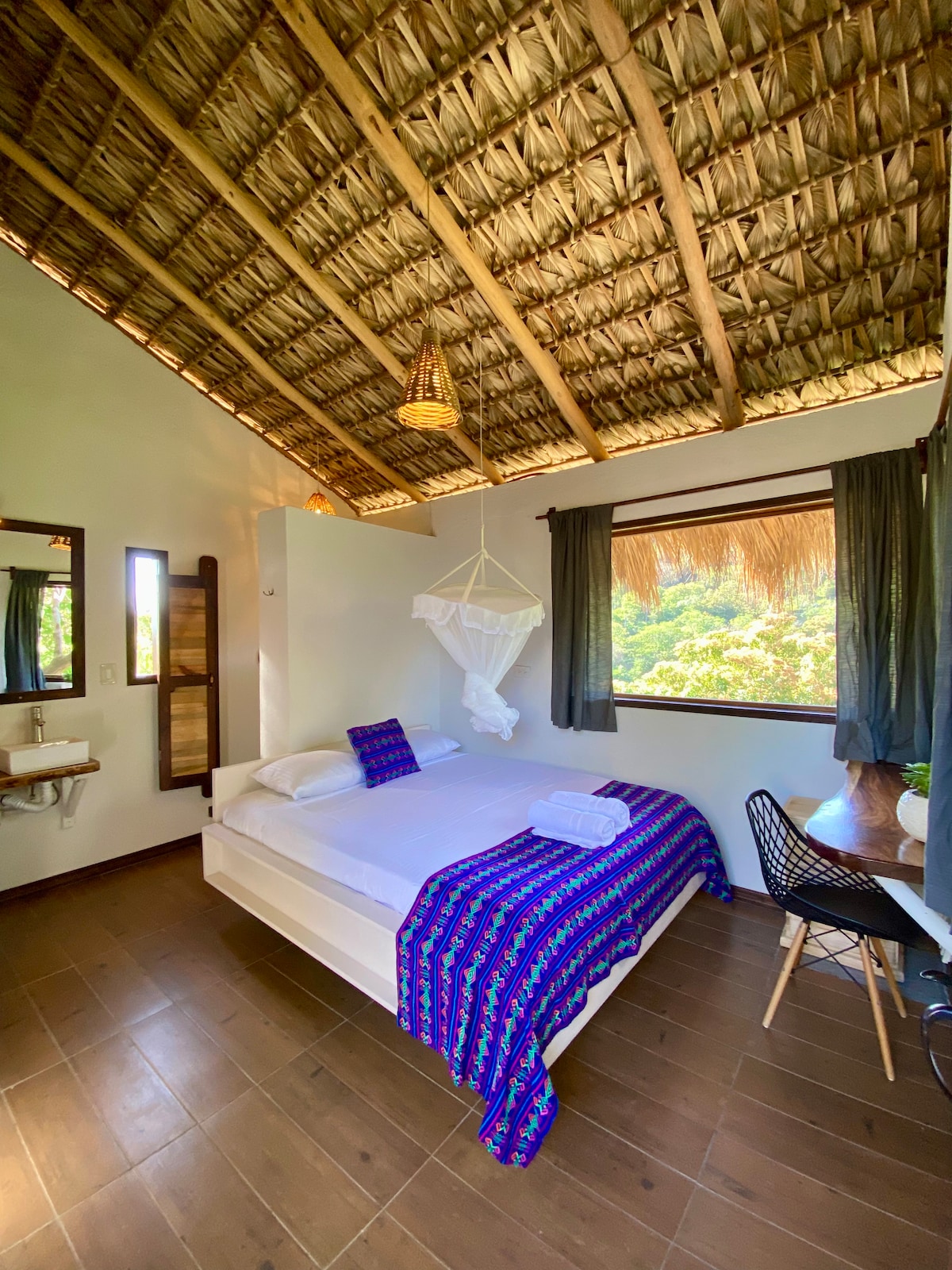 Casa El Delfin is a 3-level house only steps away from one of the most beautiful & peaceful beaches on the Pacific coast in Oaxaca, Mexico. It's located on the bay of Estacahuite just 5 minutes away from Puerto Angel (a small fishing village) & 40 minutes from Huatulco Airport. This listing is for the bungalow on the rooftop (3rd floor). It includes the entire rooftop (300 meters), open-air bedroom, dining space, and bathroom. The ocean view from the house is unforgettable.