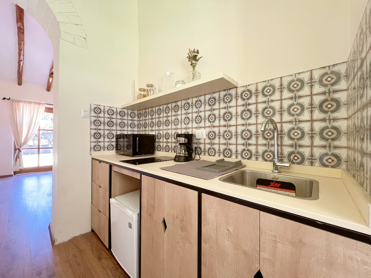 Căldură și calm în apartamentul nostru în stil rustic, cu trunchiuri de eucalipt și podea din lemn, proiectat cu mobilier colonial și frumusețe artizanală în fiecare spațiu Trezește-te la cântecul păsărilor din camera noastră cu garderobă, SmartTv de 55'cu cablu și Netflix Balcon frumos cu fotolii confortabile pentru a citi o carte cu cafea și vedere la munți și grădină Airbnb este echipat cu tot ce îți trebuie pentru o ședere confortabilă, bucătărie aprovizionată cu produse de bază și hotă