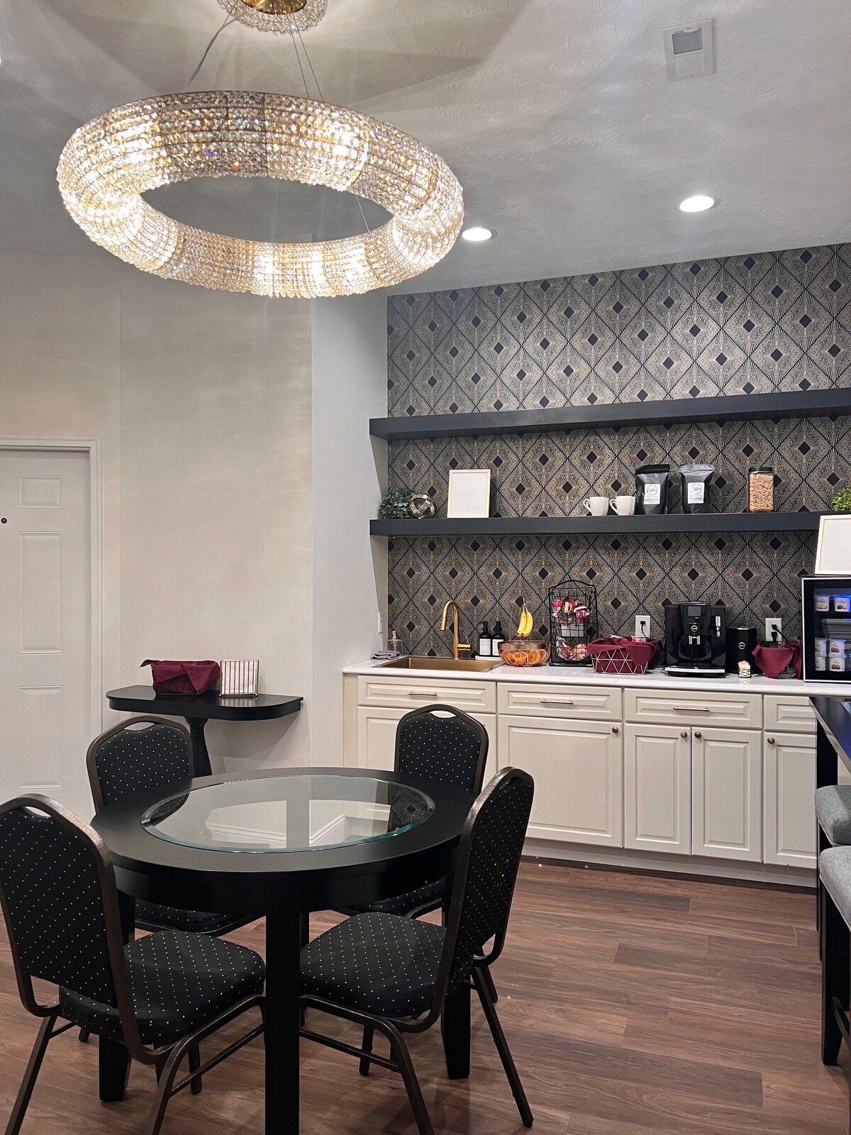 Rămâi cu plăcere în centrul orașului Le Mars, IA. La doar o scurtă plimbare de restaurante, Browns Theater, cinematograf, cumpărături, Well Visitor Center & Ice Cream Parlor și multe altele! Situat la intersecția dintre Central Ave și Plymouth St (Hwy 3). 4 camere de hotel tip boutique, fiecare cu propriul decor și stil unic. La nivelul superior al centrului central de evenimente. Parcarea este situată convenabil pe strada principală în timpul zilei și seara, într-o parcare situată chiar în spatele clădirii. Apartamentele sunt situate la etajul 2. NU LIFT Opera are un pat king-size cu pietre prețioase, TV inteligent mare, scaun supradimensionat cu bijuterii și un set de mese și scaune. Apartamentul are o chicinetă, inclusiv un frigider și un cuptor cu microunde. Bucătăria este aprovizionată cu veselă, tacâmuri și ustensile pentru gătit ușor! Fiecare ședere include cafeaua noastră preferată din nord, Caribou Coffee cu propria cafetieră Keurig, o varietate de ceaiuri, gustări, sticle de apă, popcorn și Lindt Chocolate! Baia are un duș complet aprovizionat cu lenjerie de pat, săpun, șampon și balsam și uscător de păr.