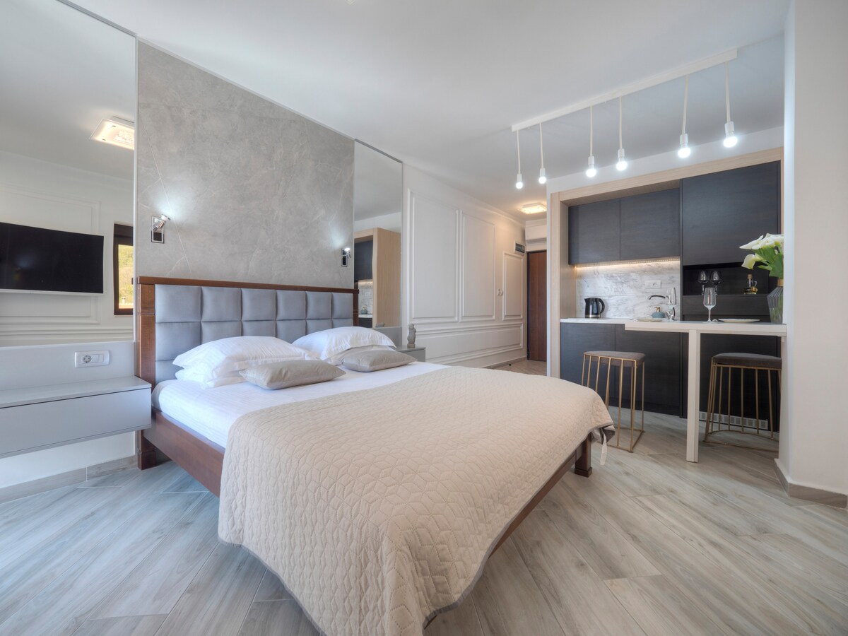 Welcome to our modern couple studio with terrace. Misisuone apartments are located in a Mediterranean Villa in a peaceful neighbourhood, only one kilometre away from the nearest Slovenska Beach and 300 meters away from several good restaurants, grocery stores and shops. We provide clean and comfortable apartments with free private parking and wifi. Hospitality of our staff will make you enjoy your stay in our nicely decorated and well equipped apartments.