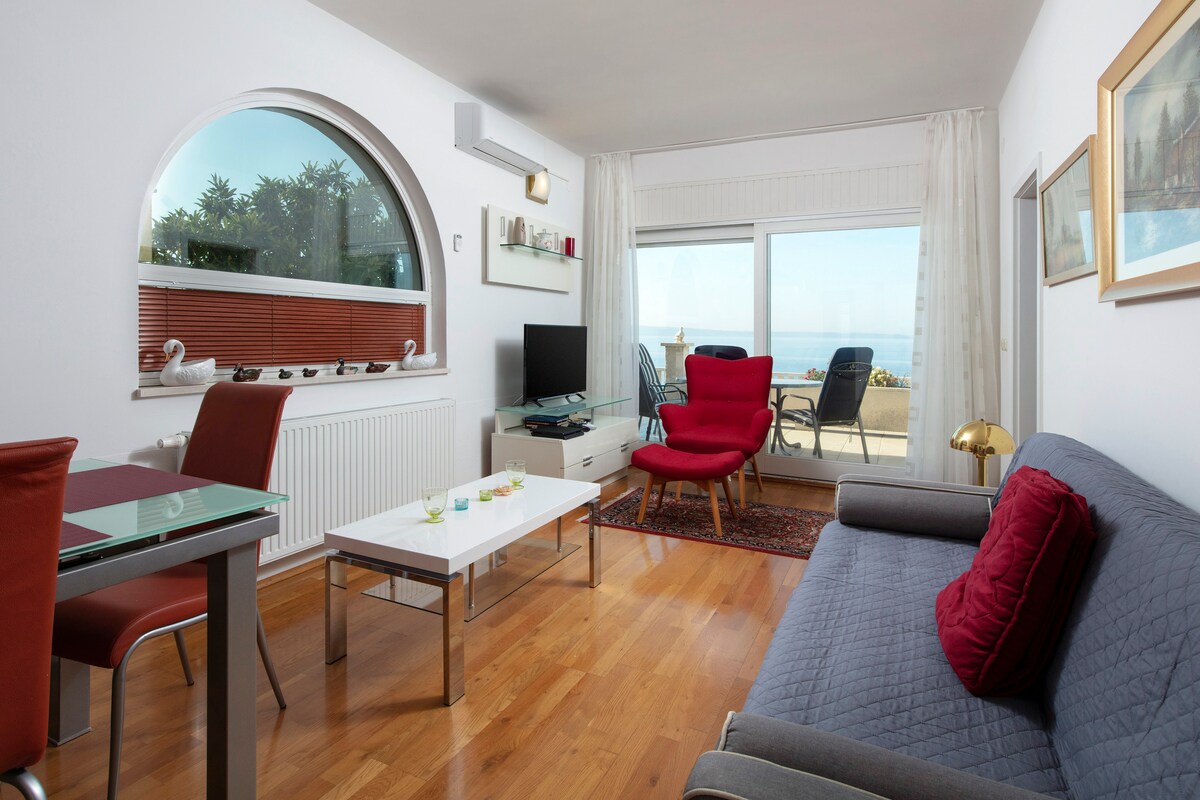 Bine ai venit în apartamentul nostru modern, cu vedere perfectă la mare. Apartamentul este format din 3 dormitoare, 3 aer condiționat, 2 băi, living cu bucătărie și sufragerie cu canapea extensibilă. Cazarea ta include grădină cu jacuzzi și loc de joacă pentru copii, terasă cu grătar și loc de parcare rezervat doar pentru tine. Suntem situați în Podstrana, în spatele stațiunii populare de hotel Le Meridian Lav, la 4 minute(150 m) de plajă (scurtătură fără a traversa drumul numai cu scări). Este un apartament pentru 7 persoane.