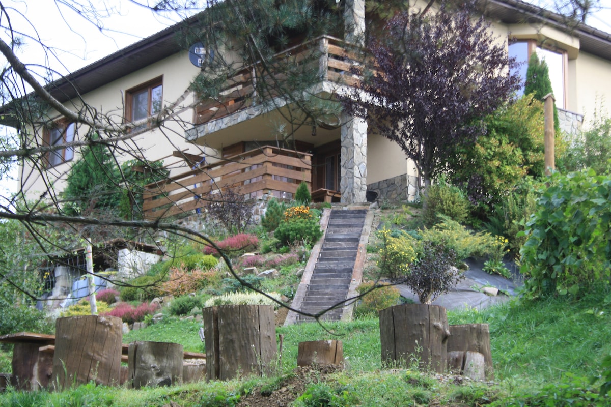 Nasz apartament w Bieszczadach to wydzielona część drewnianego domu z osobnym wejściem i wyjściem bezpośrednio na duży ogród. Dom znajduje się w małej osadzie pośród lasów, na granicy działki płynie Mikowy potok. Duża ilość szlaków pieszych w okolicy, szum potoku, czyste powietrze, niebo na którym przy bezchmurnej nocy widać całą drogę mleczną, wieczorne ogniska to tylko mały ułamek tego co można u nas doświadczyć. My, czyli gospodarze możemy być na miejscu w drugiej części domu.