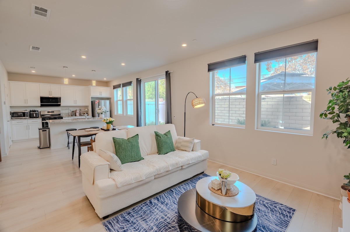 Găzduită de ușa galbenă! Această locuință spațioasă concept deschisă este situată în însoritul Fullerton, CA. Pregătește mesele împreună în bucătăria noastră mare, complet aprovizionată, care curge direct în sufragerie și living sau grătar în frumoasa curte din spate, cu o piscină și spa remodelate. Piscina și spa-ul sunt disponibile pe tot parcursul anului pentru a face o baie sau a te relaxa în spa. Jocuri de exterior și de interior de familie și prieteni se pot bucura!