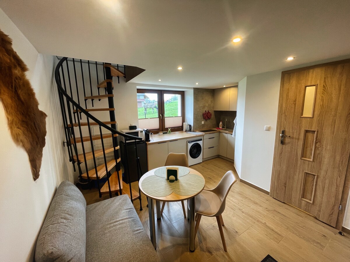 Zapraszamy do naszego uroczego domku góralskiego z kominkiem,domek posiada 2 sypialnie,salon ,aneks kuchenny w pełni wyposażony,TV,bezpłatne WIFI,duży taras. Domek znajduje się w spokojnej okolicy w pobliżu lasu i łąki ,nad rzeką Czarny Dunajec. Miejsce jest doskonałą bazą wypadową w góry ,do Dol. Chochołowskiej jest zaledwie 2km do Dol.Kościeliskiej 3km ,do Zakopanego 9km.Jeżeli jesteś zmęczony ciągłym brakiem czasu dla Siebie i rodziny zapraszamy do nas :)