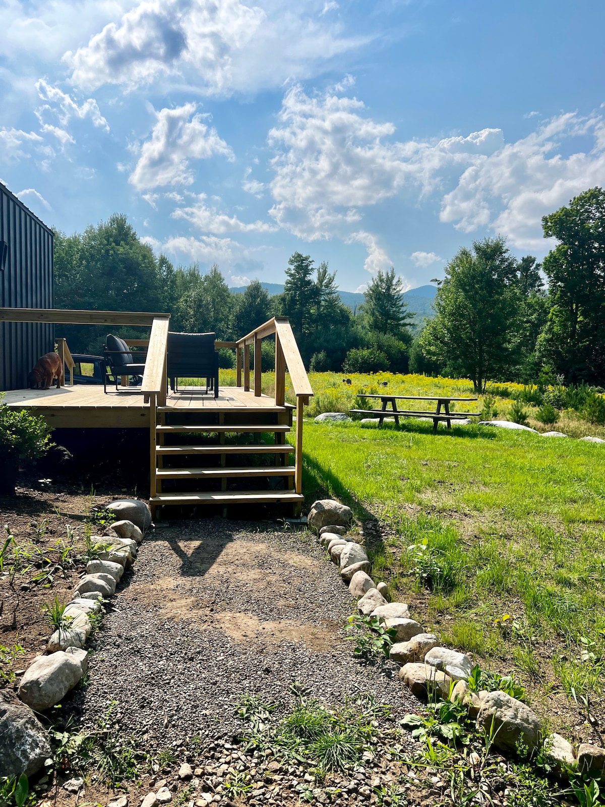 Cazează-te într-o cabană modernă liniștită, situată central pe un drum de țară din Keene, Home of the High Peaks din Adirondacks. Doar 15/20 de minute de mers cu mașina până la toate atracțiile principale: Lacul Placid, Whiteface, Adirondack Loj și Barajul Marcy. O oază luminoasă și liniștită pentru a te relaxa din aventurile tale ADK cu vedere la munți din pat, de pe terasă sau de pe vatră. Bucură-te de o pajiște privată cu acces la un pârâu natural cu găuri de înot și cascade. Pat matrimonial + canapea extensibilă care poate găzdui 1 adult/2 copii. RELAXEAZĂ-TE!