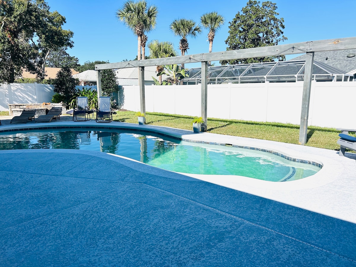Beachy, family-friendly pool home with 4BR/2.5BA in a quiet Port Orange cul-de-sac. Fenced yard thats great for pets, covered patio with tv, pool, fully equipped kitchen, and cozy living space. Stocked with the essentials— smart TVs, strong Wi-Fi, a washer/dryer, and a fire pit. 1 king suite, 2 queen rooms, and 2 twin beds in one room. Take a quick stroll to Port Orange's famous ice cream shop, Neighbors or All Children's Park. Perfect for families looking for a fun, comfortable coastal getaway.