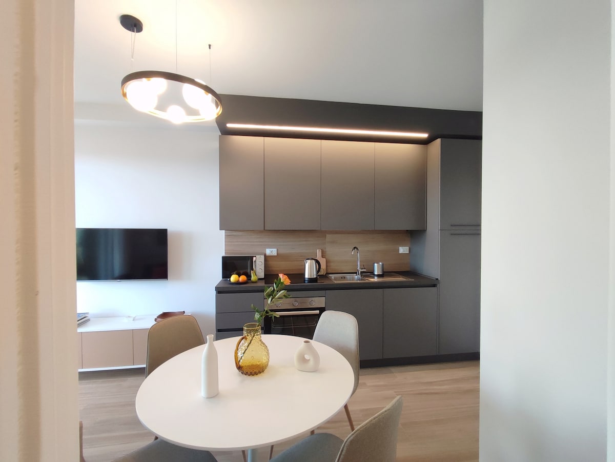 Bomboniera la o aruncătură de băț de mare, cu un balcon mare. O stradă închisă asigură liniștea sufletească a vacanței, cu toate dotările la îndemână. Oferim un studio spațios cu mobilier elegant și industrial, luminos și confortabil. 300m de malul mării renovat, plin de viață și cu activități nesfârșite ideale pentru copii și adulți. Puteți merge pe jos sau cu mașina pe pista de biciclete de pe malul apei și puteți alege din multe locuri care sunt caracteristice pentru fiecare tip de gust.