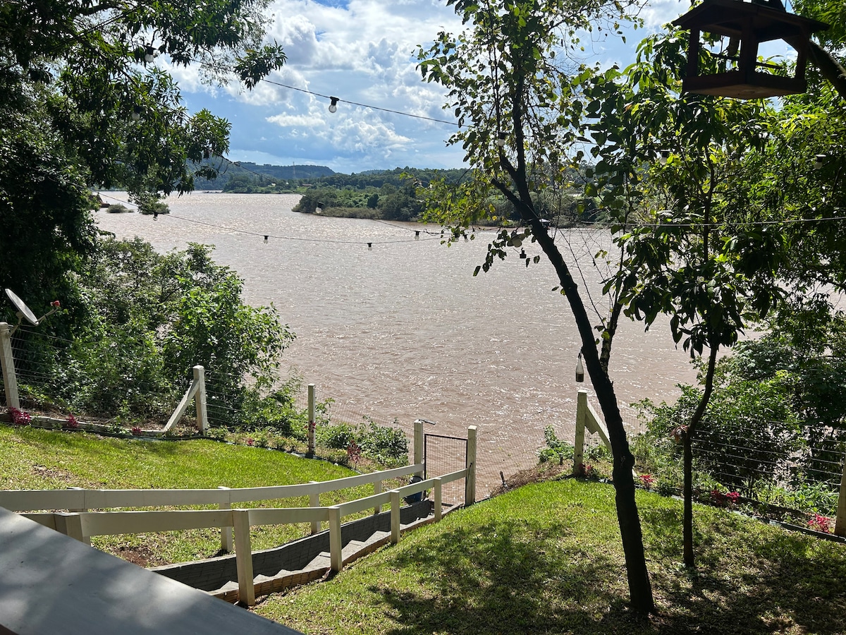 Casa com acesso particular ao rio Uruguai, Próxima do centro da cidade (800m) 2 quartos climatizados sendo um suíte com cama king, com frigobar e televisão.Acesso Wi-Fi Casa toda monitorada com câmeras externas e pátio cercado, com portão eletrônico Garagem coberta. Espaço de lazer com balanços e campo de futebol Churrasqueira interna e externa Cervejeira Sala e cozinha conjugada e climatizada Sala com sofá retrátil e TV a cabo Cozinha toda equipada com utensílios, micro, forno, geladeira.