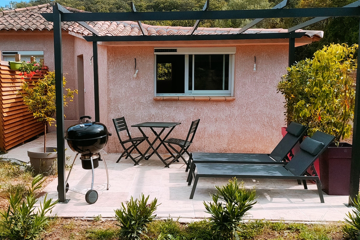 Cazare în stil studio la parter lângă vilă Parcare privată mare pe proprietate împrejmuită Facilități grătar plancha mobilier de grădină pentru masa de prânz în aer liber Nuanță de legume Pentru masa de prânz sub suprafața de stejari de 30 m2 bucătărie echipată mașină de spălat vase aer condiționat Wifi, Baie cu duș italian WC. 1 km de satul Sfânta Lucia de Porto-Vecchio și toate magazinele de pe drumul spre plaja din Pinarello și 15 minute de celebrele piscine naturale ale cavo