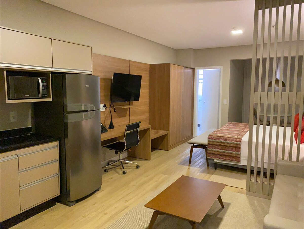 Studio la înălțime, cu o priveliște clară, conceput pentru o ședere liniștită, confortabilă și fără griji. Mediu modern, nou, liniștit și confortabil, ideal pentru relaxare sau pentru a lucra în intimitate. O experiență la standarde de hotel, cu de toate pregătit pentru a te face să te simți ca acasă, cu calitate, exclusivitate și o poziție excelentă, lângă centrul comercial Iguatemi. Perfect pentru călătorii de agrement sau de afaceri.