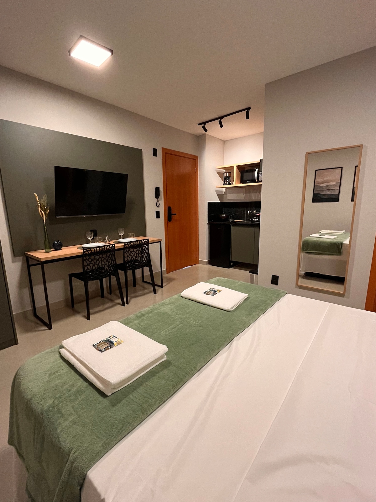 Apartament modern, 32m2, situat în cel mai bun punct din Sion. Practică în bucătărie cu minibar, plită, TV (canale deschise/Netflix), aer condiționat, uscător de păr, fierbător electric și internet. Zona de sud, lângă Piața JK și Bulevardul Bandeirantes, cu vedere la un supermarket. Acoperișul clădirii cu sală de gimnastică, saună, piscină, zonă de living și bucătărie comunitară (apă, aparat de gheață). Curățenia la cerere este disponibilă. Clădire sigură cu concierge non-stop. *Nu există garaj inclus.