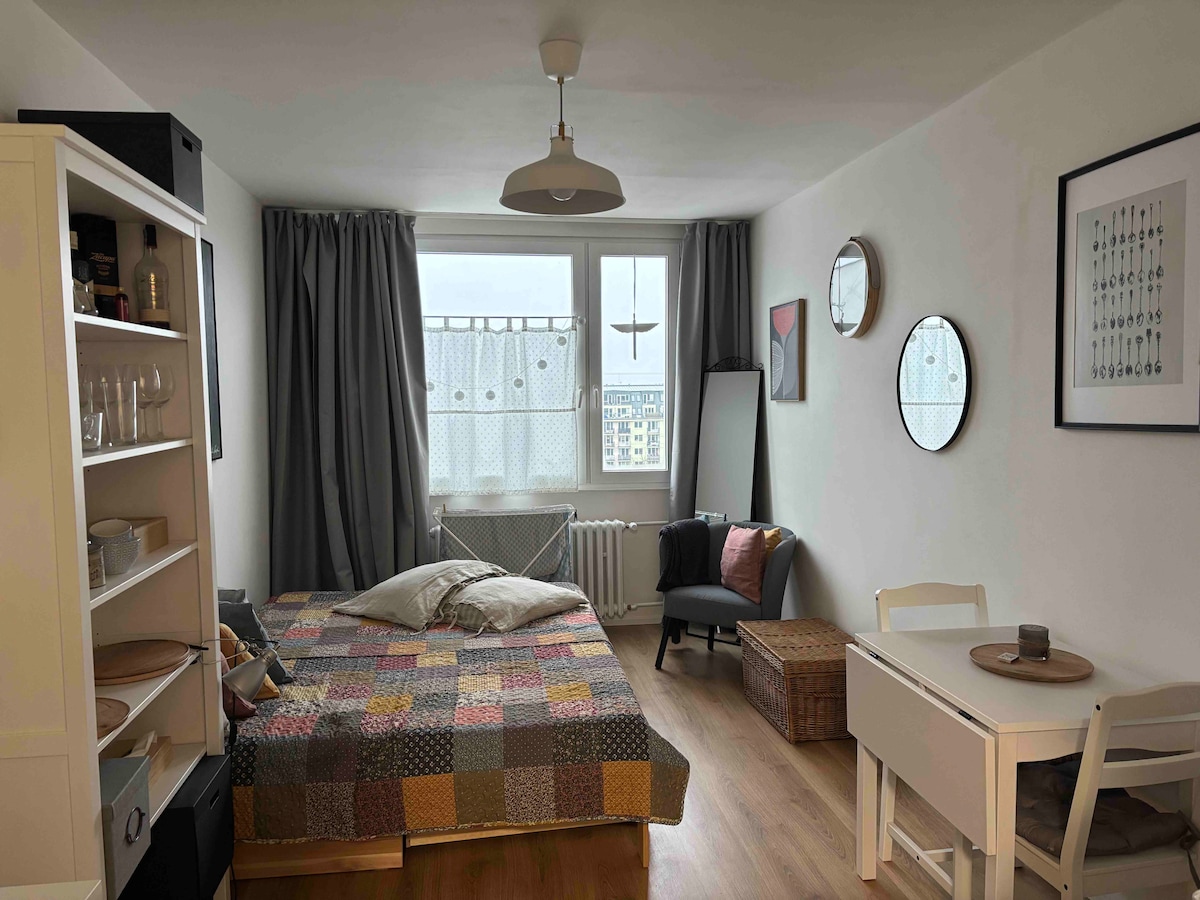 Dacă ești în căutarea unei locuințe departe de casă, ceea ce ar putea să-ți amintească de vacanțele la rudele tale minunate (adică noi), atunci ești la adresa corectă. Dacă apreciezi autenticitatea (un cartier rezidențial vechi de o sută de ani), simplitatea (fără gadget-uri inutile, dar un apartament practic și o grădină de care să te bucuri) și proximitatea centrului Pragăi (zece minute de mers pe jos până la stația de metrou și apoi 15 minute pentru a ajunge în centrul orașului), poate dorești să-ți rezervi șederea la noi!