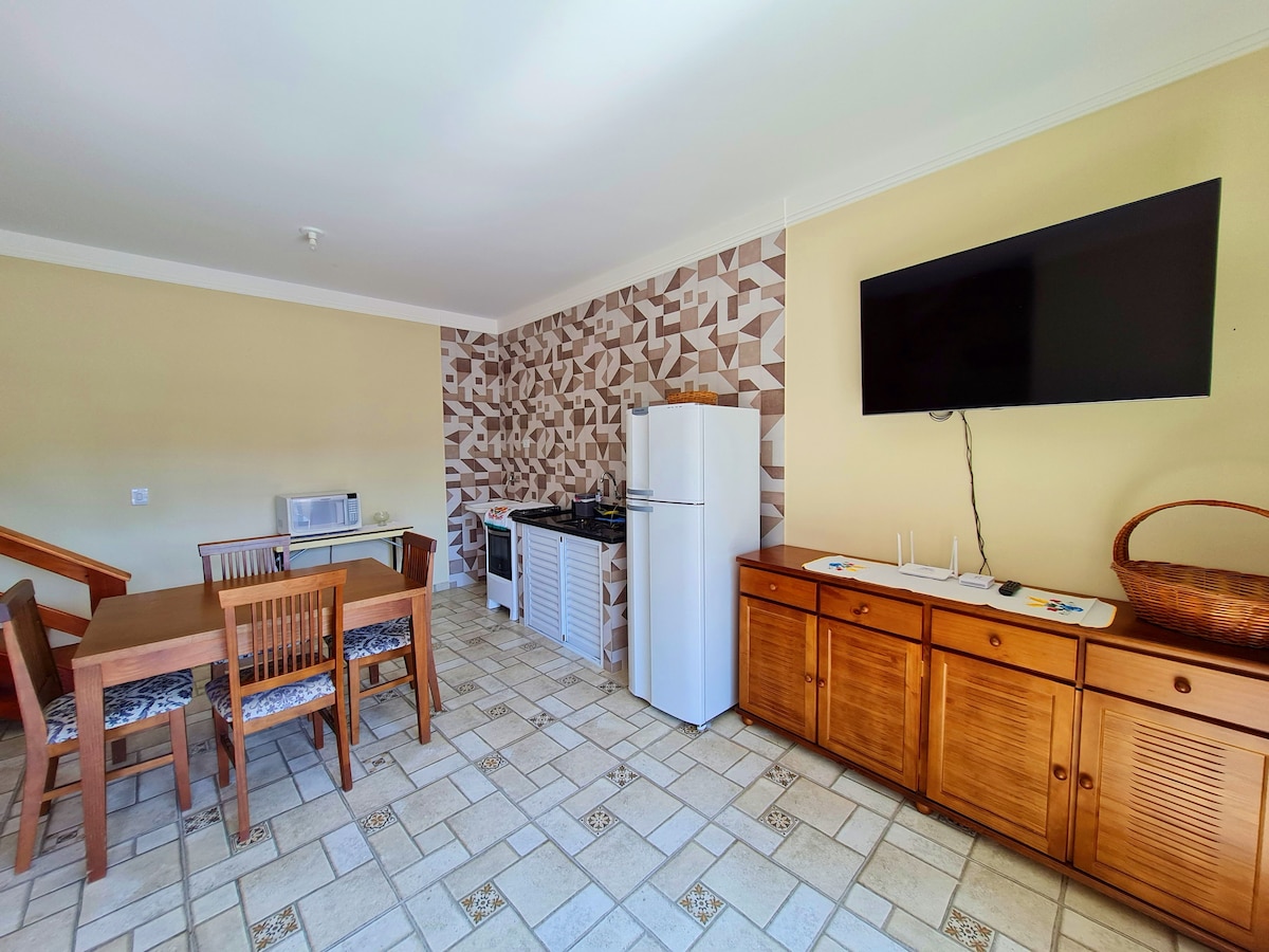 CITEȘTE ÎNTREAGA DESCRIERE ÎNAINTE DE A FACE O REZERVARE. Chalés cu grătare individuale cu bucătărie în aer liber, garantează un moment delicios de familie. Cabana are 1 pat dublu, 1 pat supraetajat și 1 bicama. Bucătăria americană simplă și completă oferă o masă economică și rapidă. Chalés confortabil, cu locație excelentă, aproape de comerț și la 4 minute de plajă! PRIZE - 110 V, CU EXCEPȚIA CUPTORULUI CU MICROUNDE, CARE ESTE 220 V. *ATENȚIE* Nu avem televizor