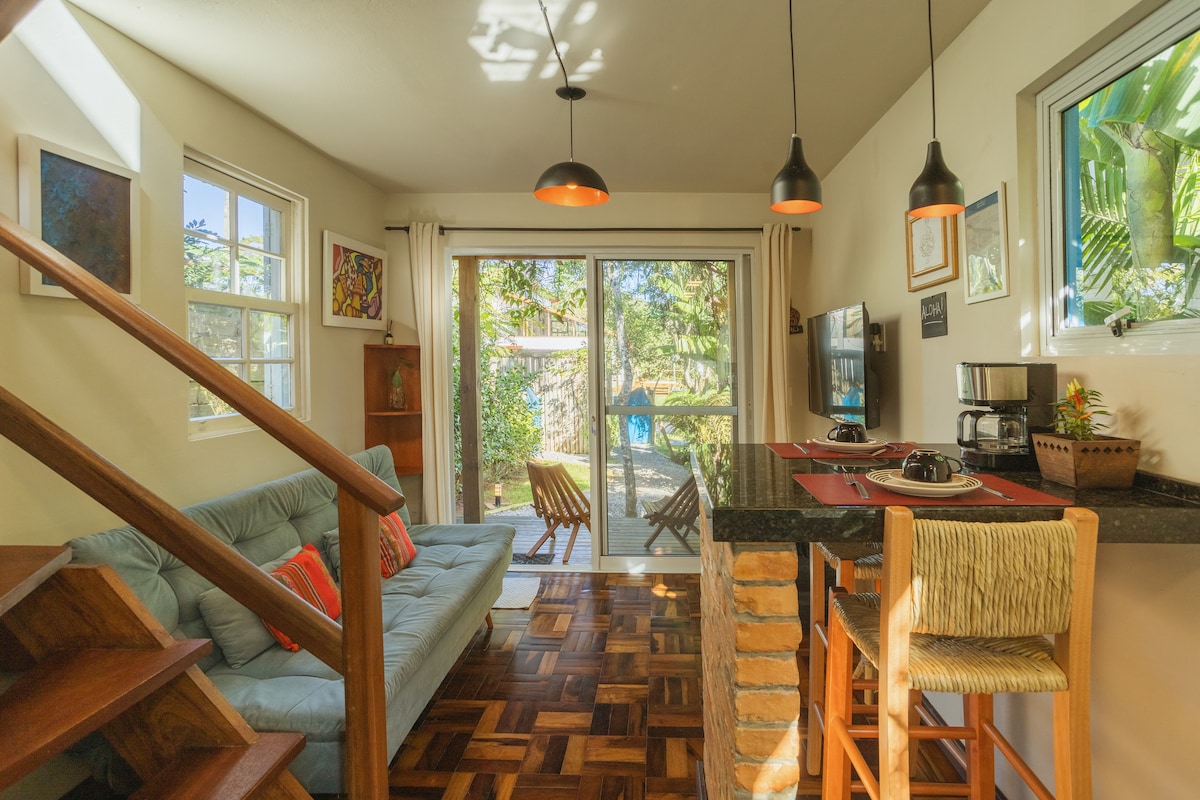 Trezește-te în pat cu răsăritul soarelui, sunetul valurilor și cântecul păsărilor!În natura luxuriantă de pe plaja Silveira, una dintre cele mai frumoase din Garopaba și o destinație preferată de surferi.Atmosfera rustică și confortabilă a fost concepută pentru a oferi confort, îmbinând arta și armonia.Wi-Fi rapid, spațiu de birou acasăCadru perfect pentru cei care doresc să trăiască o poveste de dragoste, odihnă în conexiune totală cu marea și natura.Situat la 2 km de centrul orașului Garopaba și la 300 de metri de plajă!