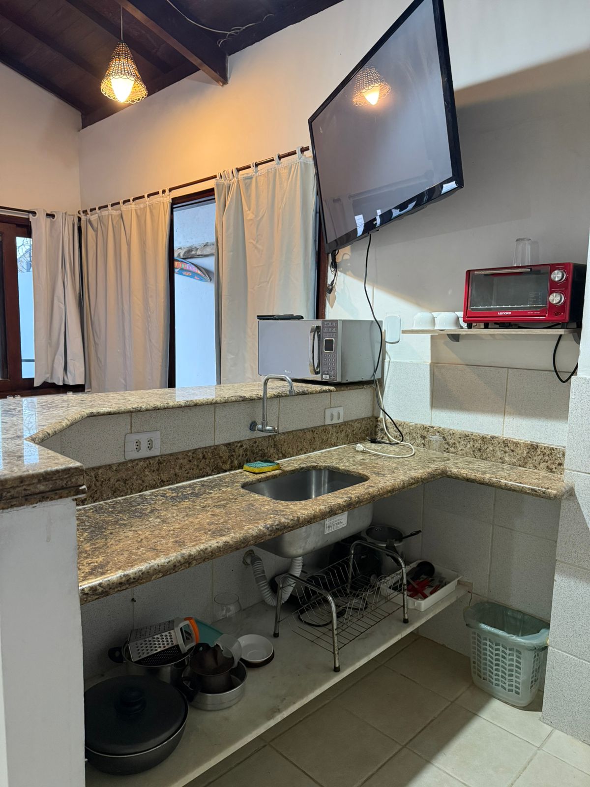 POUSADA PORTO DA BARRA PRAIA - Aproveite dias incríveis em Porto Seguro hospedando-se em um flat espaçoso na Av. Beira Mar! Com dois quartos confortáveis — um com ar-condicionado e outro com ventilador —, cozinha completa com fogão, micro-ondas, geladeira, utensílios e forno, além de sala com TV 43” e mesa para refeições. Ideal para famílias ou grupos que buscam praticidade, conforto e uma localização privilegiada, próxima às praias e principais atrações da cidade.