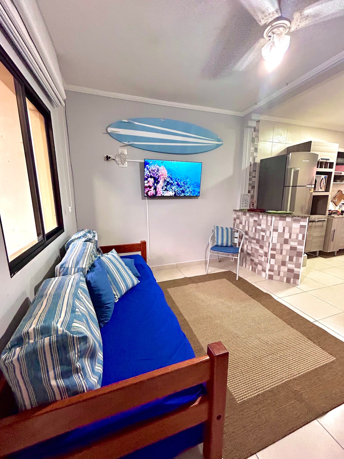 Apartamento aconchegante de frente para o mar. (50 metros) Linda vista do nascer do sol, da sacada e janelas. Praia familiar, ótima para crianças, tendo a opção de surf (lado esquerdo) e caminhada até o fim da praia (lado direito) para pescar, ver tartarugas e animais marinhos. Várias opções de lazer, entre elas: Banana-boat, passeios de escuna até as ilhas próximas. Redondeza com boa estrutura de mercados, farmácias, quiosques e restaurantes próximos, etc. Não precisa usar carro.
