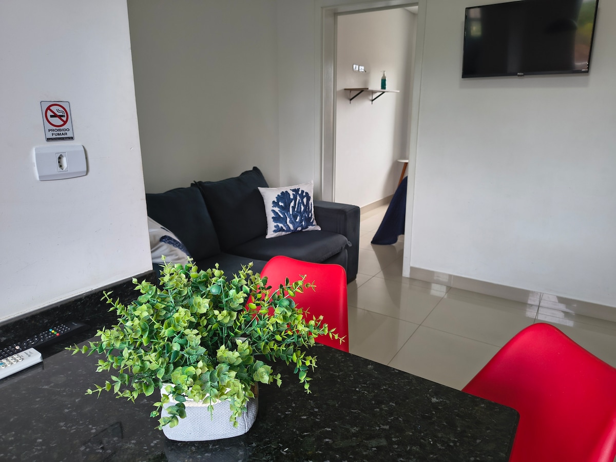 Relaxe com toda a família nesta acomodação tranquila,local seguro para todas as pessoas e pets de pequeno e médio porte com todo conforto necessário para desfrutar de uma natureza deslumbrante. Nosso ap é novo todo mobiliado com móveis planejados, Smart TV, Wi-Fi, Ar condicionado,sacada com churrasqueira,tudo para proporcionar conforto e praticidade necessária para sua estadia. Oferecemos como empréstimo raquetes e bola, cadeiras de praia, e caixa térmica pequena para sua diversão em família.