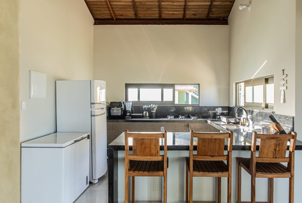 Casă fermecătoare cu 3 dormitoare, 2 dormitoare cu paturi duble și 1 dormitor cu 2 paturi single, poate găzdui confortabil 6 persoane. Într-un apartament în complex rezidențial de pe malul mării din Praia do Pé de Serra, Serra Grande/BA. La câțiva pași de nisip, cu aer condiționat, Wi-Fi cu fibră optică, bucătărie echipată, TV, spațiu gourmet cu grătar, grădină cu șezlong, duș și hamace pe balcon. Stil modern și confortabil, ideal pentru cupluri sau familii care caută confort, liniște și contact direct cu natura.