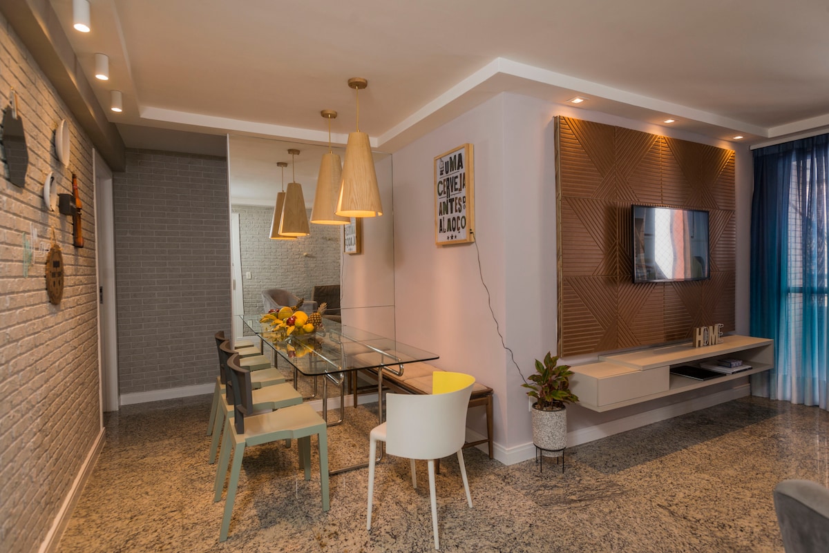 Apartament complet renovat, cu paturi noi, vopsea nouă, lenjerie nouă de pat și de baie, perdele noi, hamac nou. Suită : pat dublu nou, dulap, aer condiționat nou divizat, baie cu duș electric și cutie Cameră: un pat dublu nou, aer condiționat împărțit. Baie socială: duș electric și duș. Bucătărie : aragaz, frigider, veselă, pahare, oale și tigăi și tacâmuri, cuptor cu microunde. Sala: Sofá Cama, TV Smart e WI-FI. Masă cu patru scaune, balcon. * Saltea suplimentară disponibilă pe site