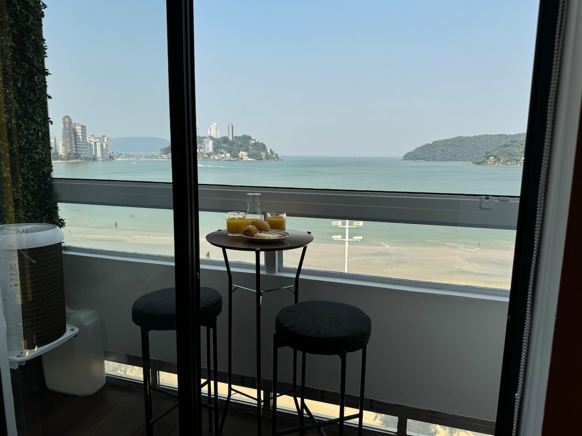 Studio fermecător cu vedere panoramică la ocean!! Clădire pe malul mării Gonzaguinha în São Vicente! locație EXCELENTĂ! Spațiu confortabil cu balcon, bistro și scaune! Oferim Wi-Fi, lenjerie de pat, baie, dotări, minibar, aer condiționat cu microunde, aparat de făcut sandvișuri, plită de gătit, TV cu control Magic, pivniță cu aer condiționat, cafetieră 3 Inimi, articole de uz casnic, scaune de plajă retractabile, răcitor, skateboard, uscător de păr și fier de călcat. Poartă non-stop cu loc de parcare NUMAI pentru motocicletă