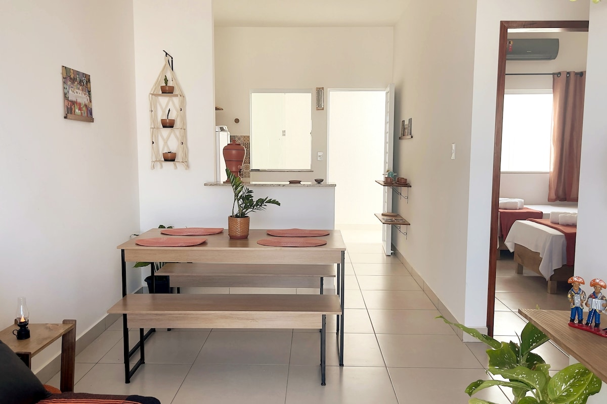 Bună, cu plăcere! =) Anunțul meu este pentru un dormitor cu apartament într-o casă de oaspeți atașată la casa mea. Vino să stai cu mine în cel mai bun cartier din Aracaju!⭐️⭐️⭐️⭐️⭐️ Aici vei găsi o cameră planificată pentru a te primi, cu: pat dublu, aer, televizor, suită privată cu duș fierbinte și lenjerie de pat și baie. Oh, un alt detaliu: deoarece spațiul este potrivit pentru oaspeți, este posibil să vă pregătiți mesele în bucătărie dotate cu vase, veselă, filtru de cafea, cuptor cu microunde și aragaz la dispoziția dvs.