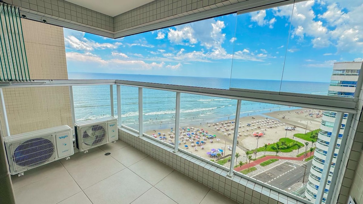 Vista frente mar total maravilhosa em um lindo apartamento decorado frente mar total 2 dorms, (1 suíte). Ar condicionado. O mais belo e encantador nascer no sol, juntamente com o delicioso barulho do mar! Você irá sentir uma paz e ficará encantado com essa experiência! Além disso tenha o privilégio de presenciar o pôr do sol frente mar numa sala de estar e jantar linda com ar condicionado, móveis de altíssima qualidade, tvs smart, cafeteira Nespresso, cozinha completa com fogão indução.