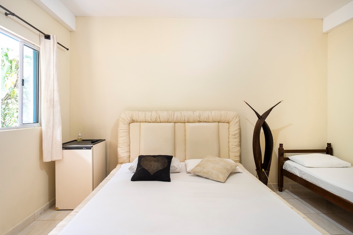Apartament mare cu intrare separată. Pat matrimonial, pat de o persoană, baie privată, ventilator de tavan, Wi-Fi, podea Varal și masă. Camera are, de asemenea, o mică structură pentru prepararea micului dejun sau a gustărilor simple (minibar, cuptor cu microunde, cafetieră electrică, aparat de făcut sandvișuri, omletă, chiuvetă și câteva ustensile). Nu permitem utilizarea unei aragazuri electrice sau cu gaz. Oferim lenjerie de pat și de baie. Parcare interioară și acoperită