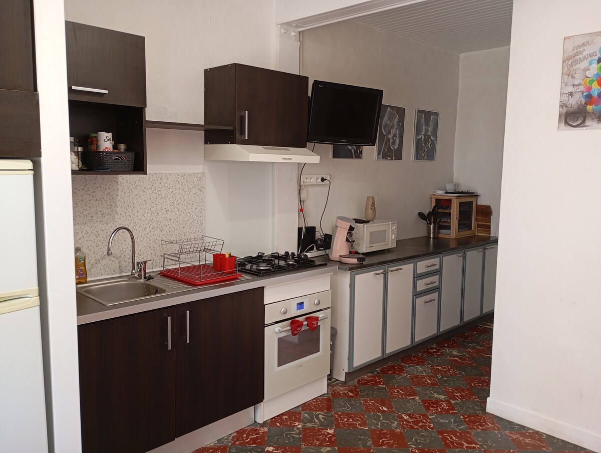 Casă în oraș Gersoise, situată ideal în inima orașului, într-un sat mic și vibrant, care este, de asemenea, Village Etape. 50 m de mers pe jos până la toate magazinele. Bucătărie complet utilată, cu sufragerie (aproximativ 20m2). Primul etaj , mansardă de 16 m2, este compus dintr-o canapea extensibilă de calitate, o primă toaletă și un duș. Există, de asemenea, un pat suplimentar și o zonă cu TV. Etajul 2 este un dormitor cu toaletă , punct de apă și birou. Atmosferă confortabilă și intimă...