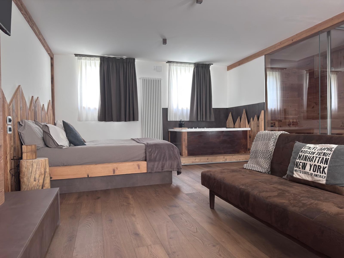 La Suite di 55 mq al piano terra è un caldo ed accogliente loft dal cuore montano. Dotata di un letto matrimoniale,vasca idromassaggio a 2 posti, angolo spa vetrato con bio sauna e doccia. La zona spa è fornita di asciugamani ed accappatoi. La cucina nascosta è attrezzata di lavello, piano induzione, microonde, frigorifero, lavatrice, macchina caffè. Comodo divano letto per i più piccini. Smart Tv 40 pollici.