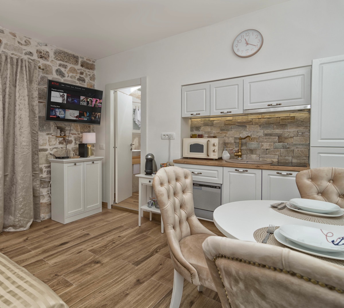 Apartament nou-nouț de 4 persoane se află într-o casă de piatră complet renovată, veche de 600 de ani, în centrul vechiului oraș Trogir. Renovat în modă modernă, cu bucătărie modernă, apartamente,Netflix,PS5,Smart TV, camere cu aer condiționat, încălzire prin pardoseală.... cu o notă de detalii tradiționale, cum ar fi pereții de piatră, grinzi din lemn...Ideal pentru dormitor conectat. Locație perfectă în centrul orașului Trogir. Oaspeții noștri au la dispoziție un loc de parcare contra unei taxe reduse la cea mai apropiată parcare oficiala din oraș.