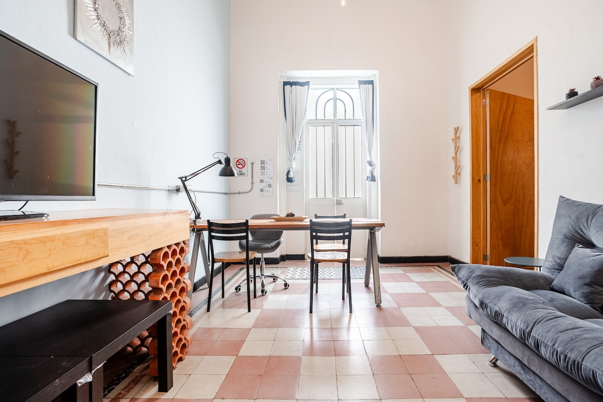„Descoperă magia Puebla în casa noastră spațioasă situată într-un cartier protejat de UNESCO, recunoscut ca sit al Patrimoniului Mondial. Bucură-te de confortul unei bucătării complet utilate, de Wi-Fi și de un Smart TV de 49”, un living confortabil și o stație de lucru pentru nevoile tale de lucru. Locația noastră este aproape de Spitalul San José, Centrul de Convenții, Casa Aguayo, Fuertes de Loreto și piețe pitorești."