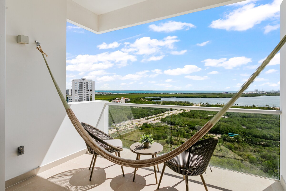 Apartament nou-nouț, complet echipat pentru o ședere plăcută și plăcută. Situat la etajul 9, are una dintre cele mai frumoase priveliști asupra lagunei Nichupté și a mării. La doar câțiva pași vei găsi faimosul Spital Galenia (Fertility Center Cancun), supermarketul „Walmart Express”, multe mall-uri, restaurante și cafenele. Apartamentul are piscină proprie, sundeck, grătar, sală de gimnastică și o parcare subterană mare.