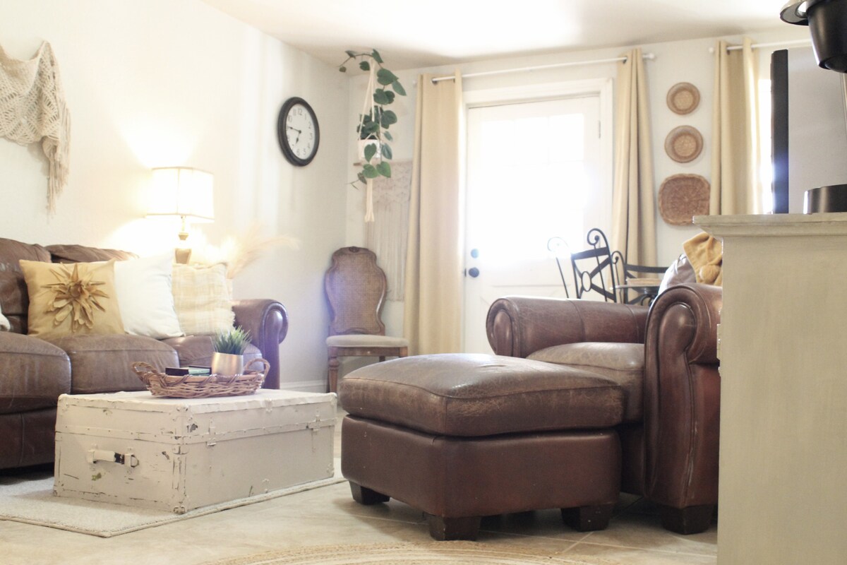 Subsolul nostru Boho este o cazare excelentă la un preț accesibil. Situat convenabil, la 1,6 km de autostrada interstatală, subsolul nostru cu acces direct este un loc unic în care să te odihnești și să te bucuri de sejur. Urcați pe aleea noastră de țară, treceți de curtea cu grajdul și parcați în paralel chiar în fața subsolului Boho. Vei intra în subsolul cu ieșire prin propria intrare privată și îți va plăcea să te întorci afară pentru a sta pe terasa liniștită sau pentru a-ți întinde picioarele pe traseul Santa Fe. Te așteptăm cu nerăbdare aici!