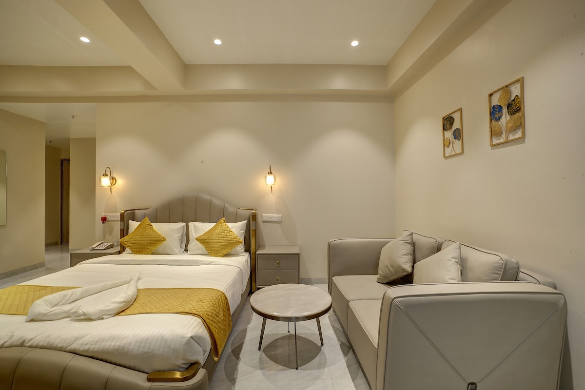 Relaxează-te în această cameră King spațioasă, cu interioare moderne, lenjerie de pat de pluș și o atmosferă calmă, perfectă pentru muncă sau petrecere a timpului liber. Situat în inima orașului Kharadi, Pune.