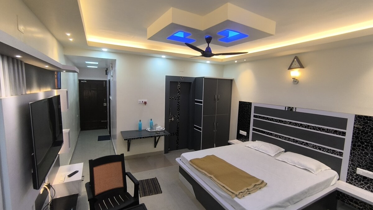 It's a very spacious room with balcony. Well Interior with kitchen accessories. Cloud kitchen also available, food can be delivered at your door steep option available. Guest house is nearer to beach & temple. Ample space for parking available. Another 17nos of rooms also available, can be given. Cab and Train Tatkal Ticket facility also available.