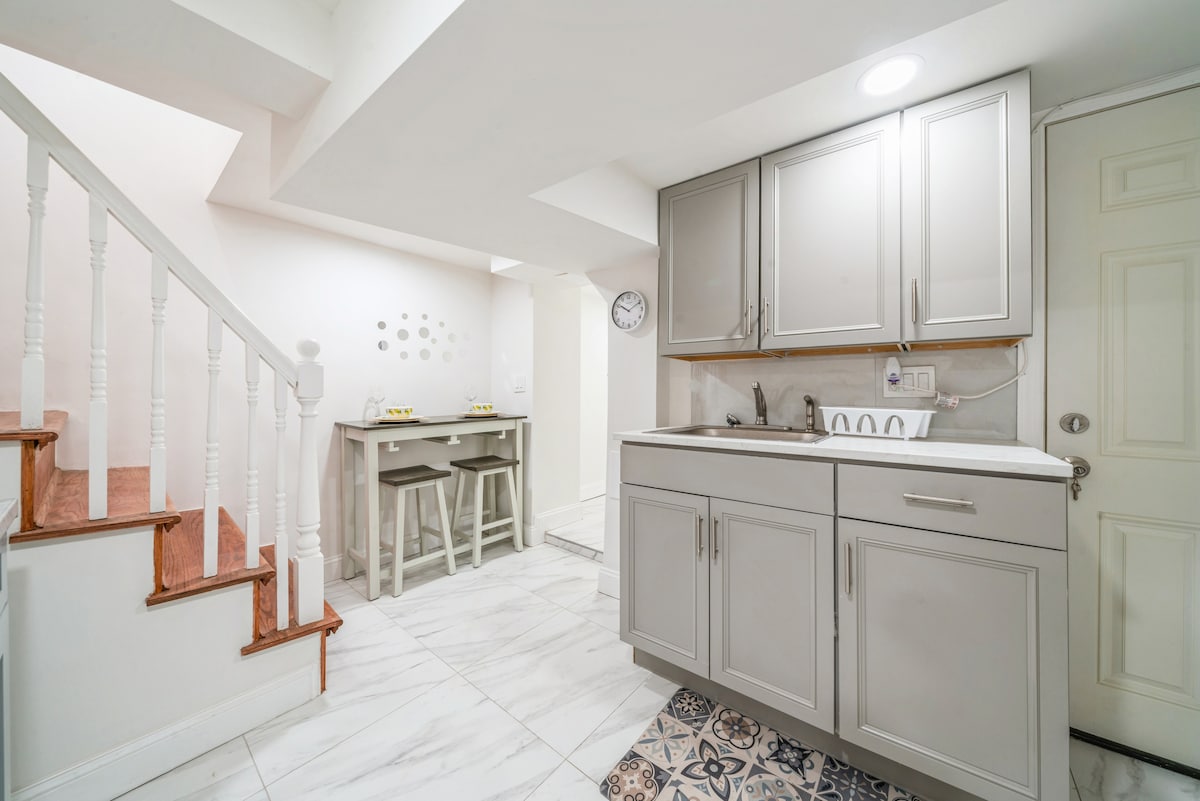 Confortul său te va face să te simți ca acasă în secunda în care intri. Această suită drăguță de oaspeți de 280 mp de la parter este complet mobilată și frumos decorată - vine cu tot ce îți poți imagina. Se compune din 1 dormitor, 1 baie și o zonă de bucătărie/sufragerie/living Dimensiunile camerelor: Dormitor: 10 ft x 7 1/2 ft Zona LR Kitchen DR: 19ft x 10ft Baie: 40" x 80" Având în vedere cât de aproape este de tot - este perfect pentru oaspeții care intenționează să facă naveta în oraș cu trenul sau să se deplaseze cu Uber.
